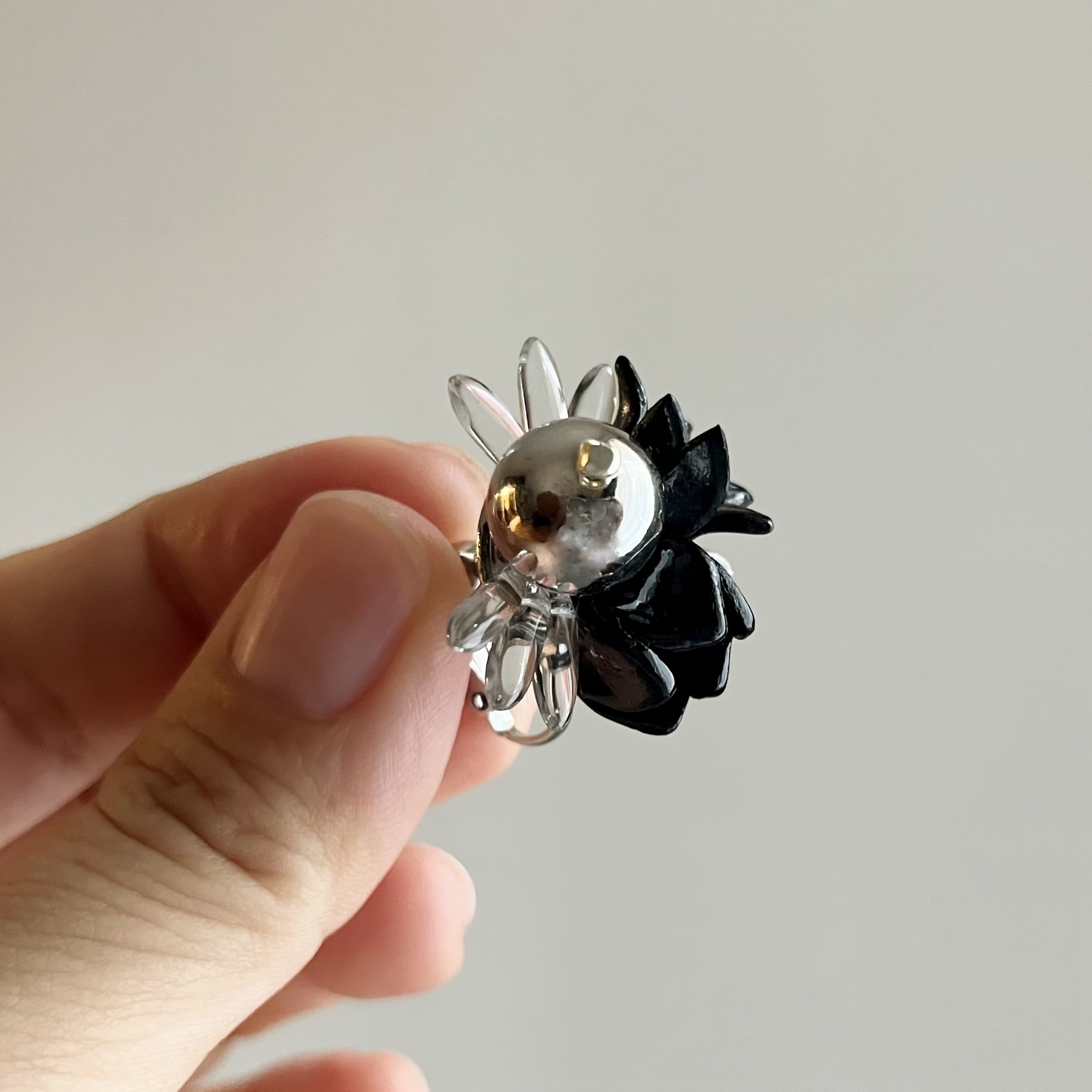 メタリックなパーツと艶やかなブラックフラワーのコンビがクールな印象のイヤリング。