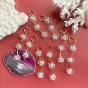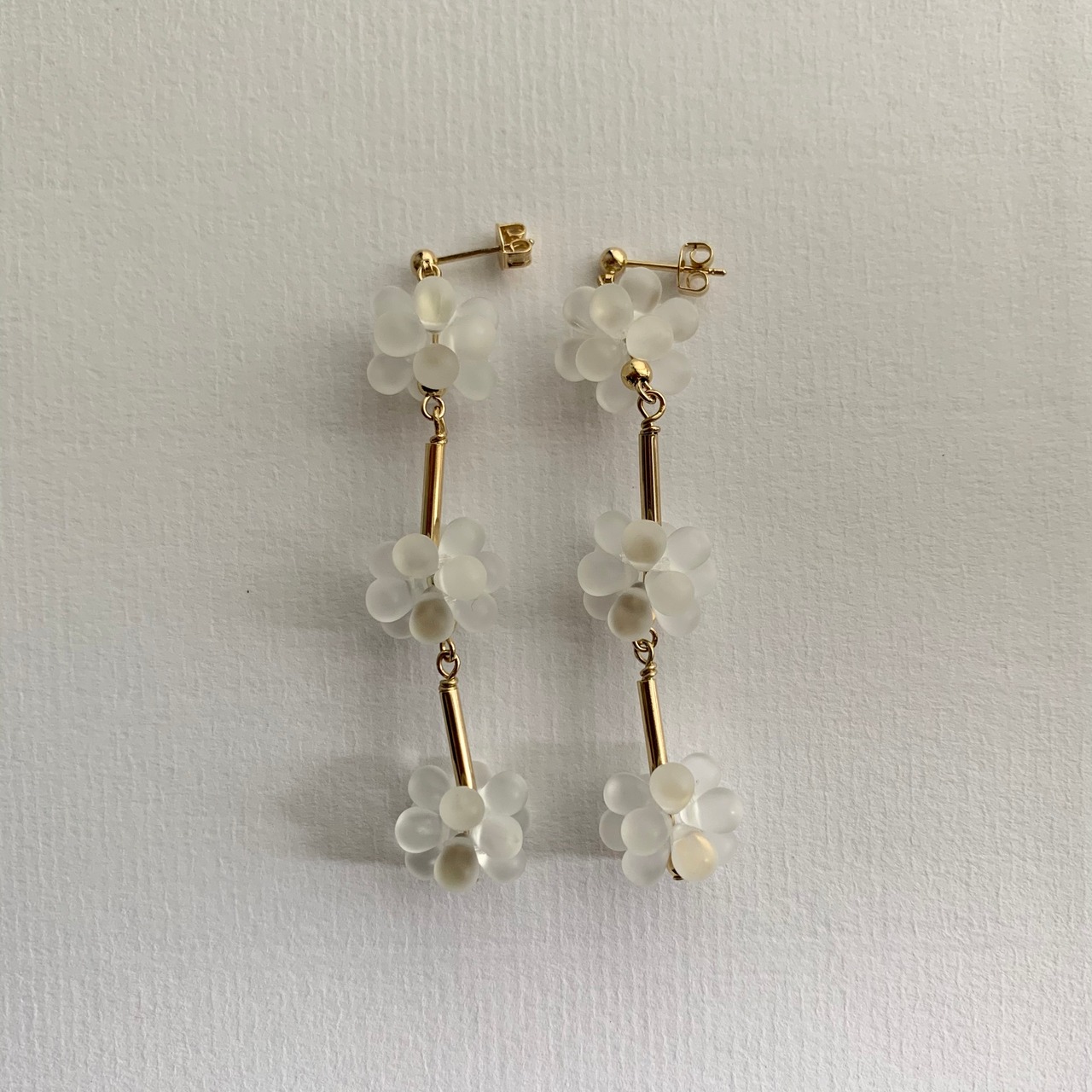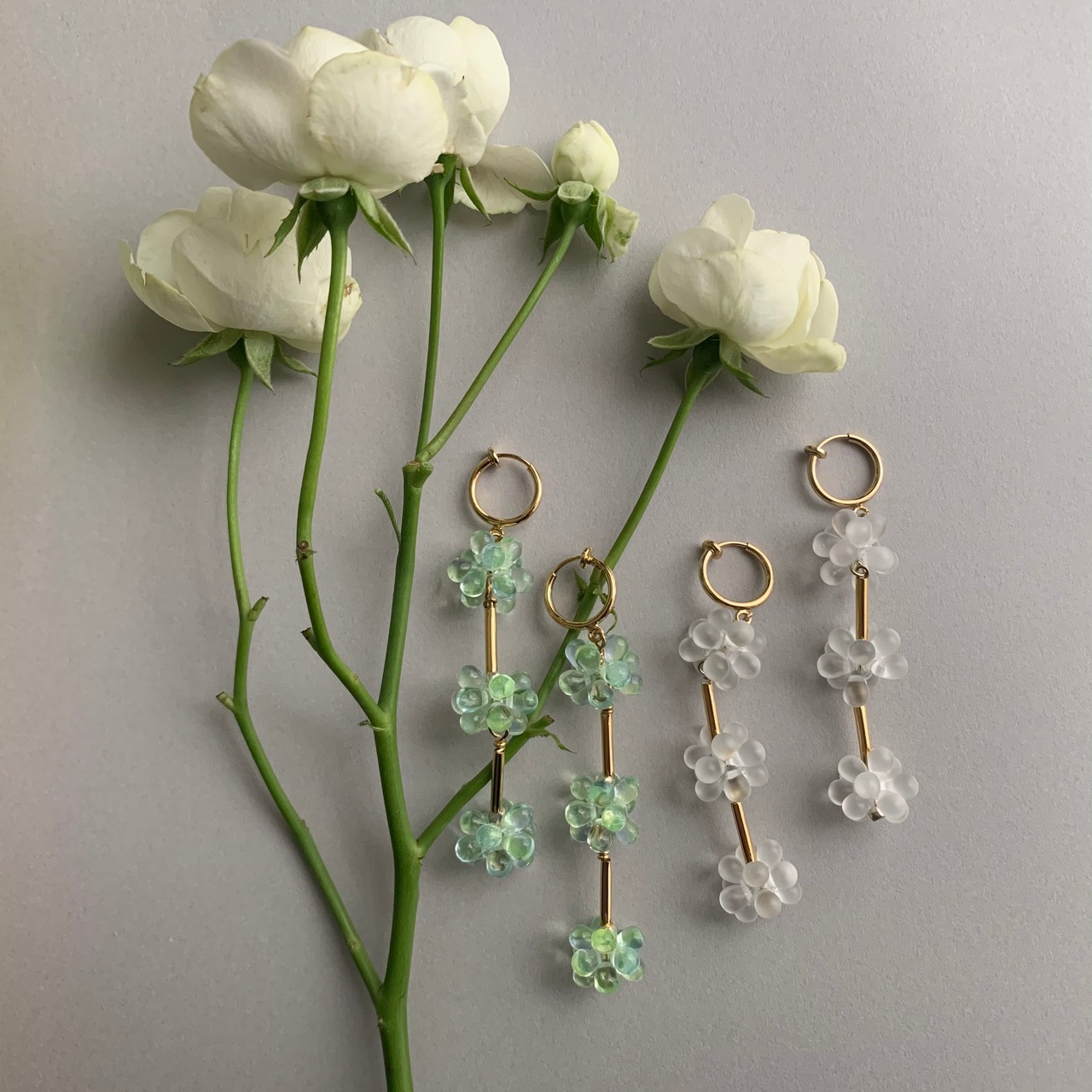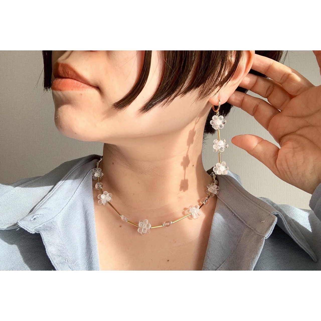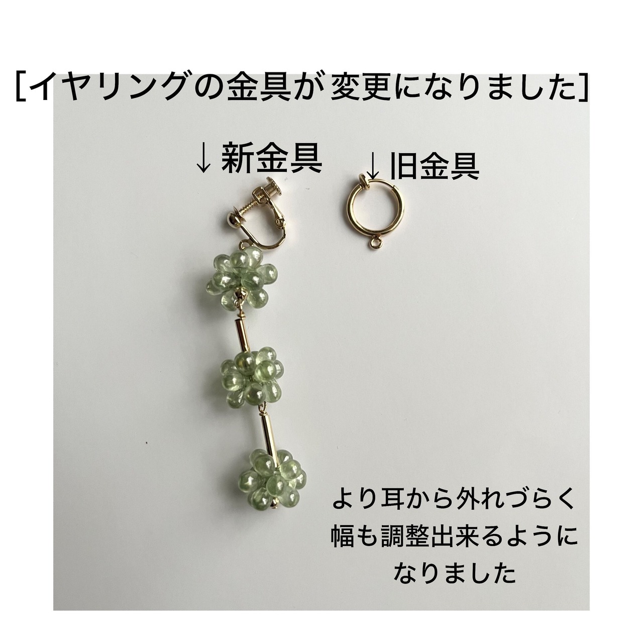 すりガラスのような半透明の雫型のチェコビーズを12個編んで作った海ブドウのようなボールのパーツを主役に。つぶつぶとした球体のフォルムがなんとも言えない愛らしさとほどよい主張をしてくれます。