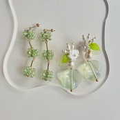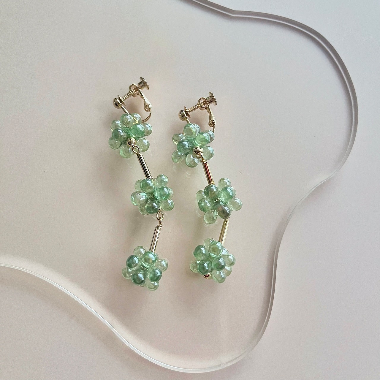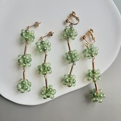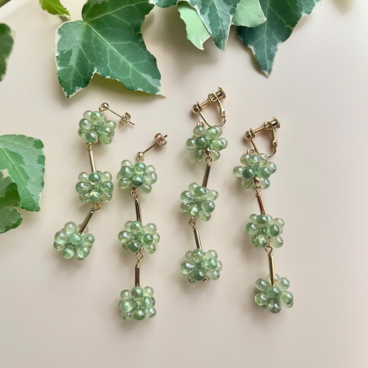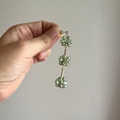 雫型のチェコビーズを12個編んで作った海ブドウのようなボールのパーツを主役に。つぶつぶとした球体のフォルムがなんとも言えない愛らしさとほどよい主張をしてくれます。