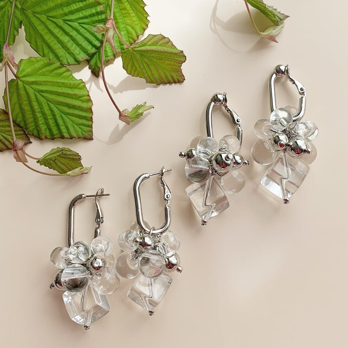 ぶくぶくとバブルのようなビーズに、スクエアのクリアパーツを組み合わせた、立体感のあるユニークなシルエットのイヤリング&ピアスです。