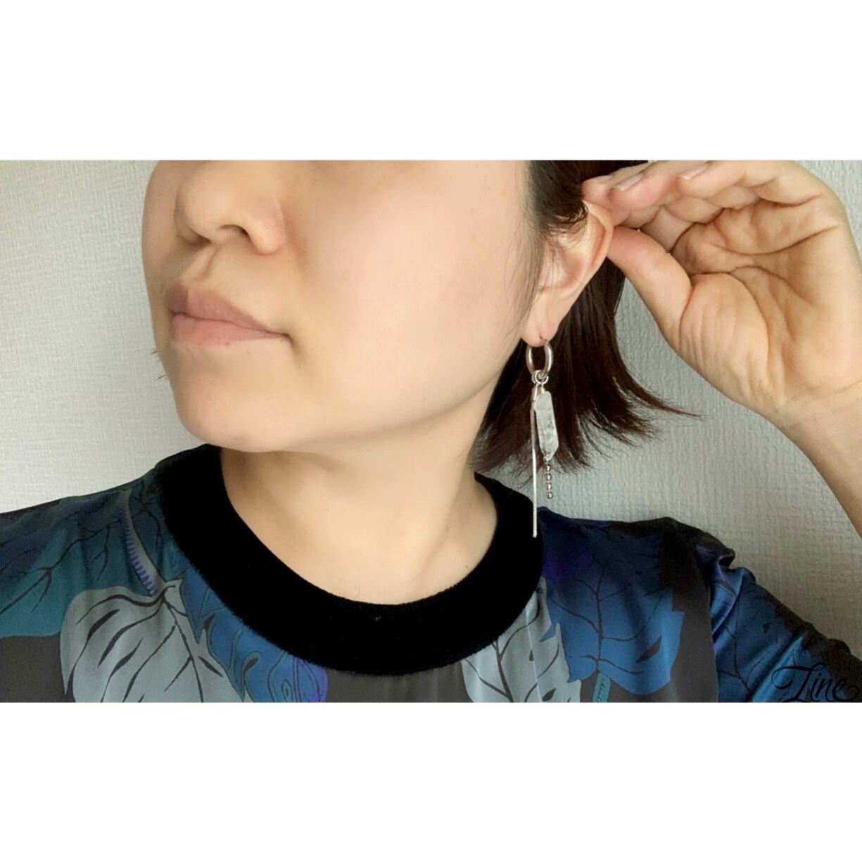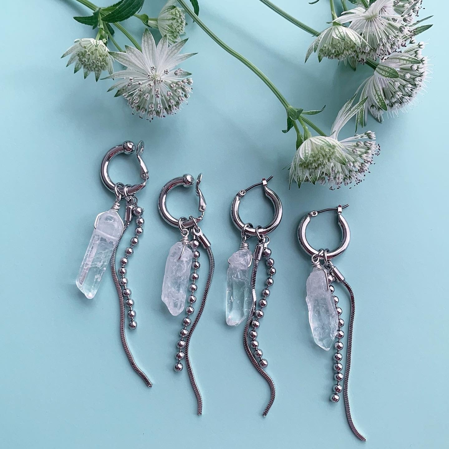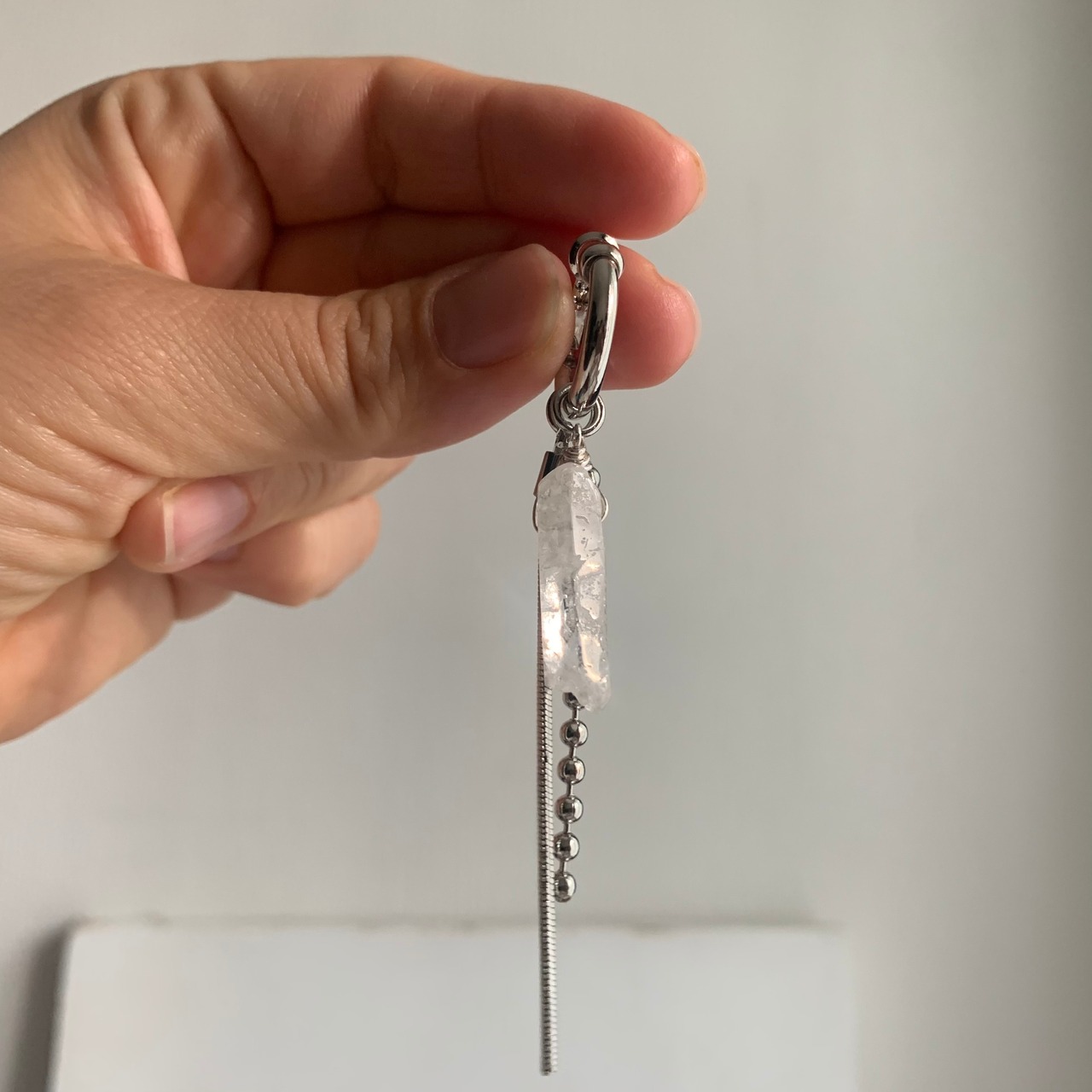 天然石のクリスタルを使った涼しげでシャープなイヤーアクセ。