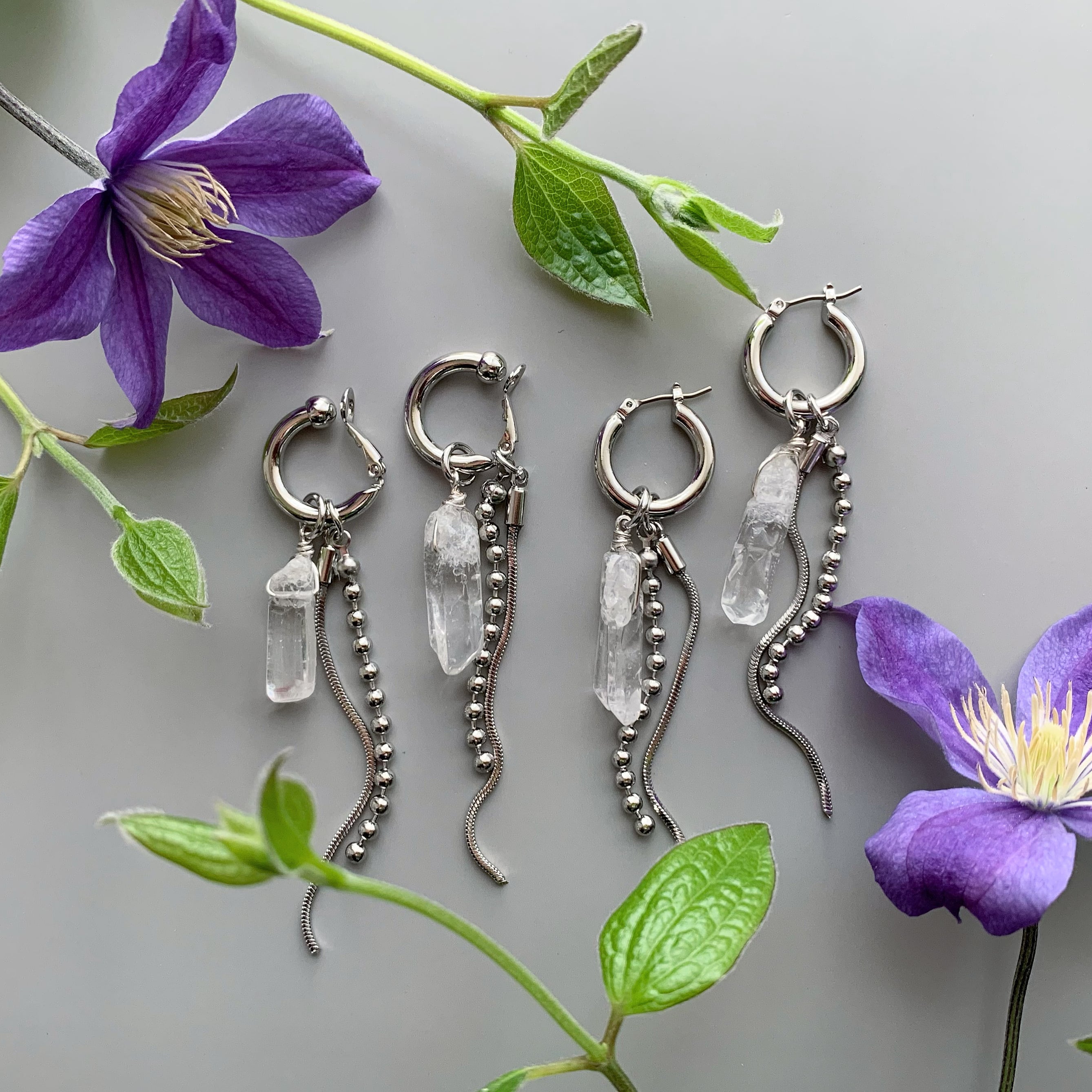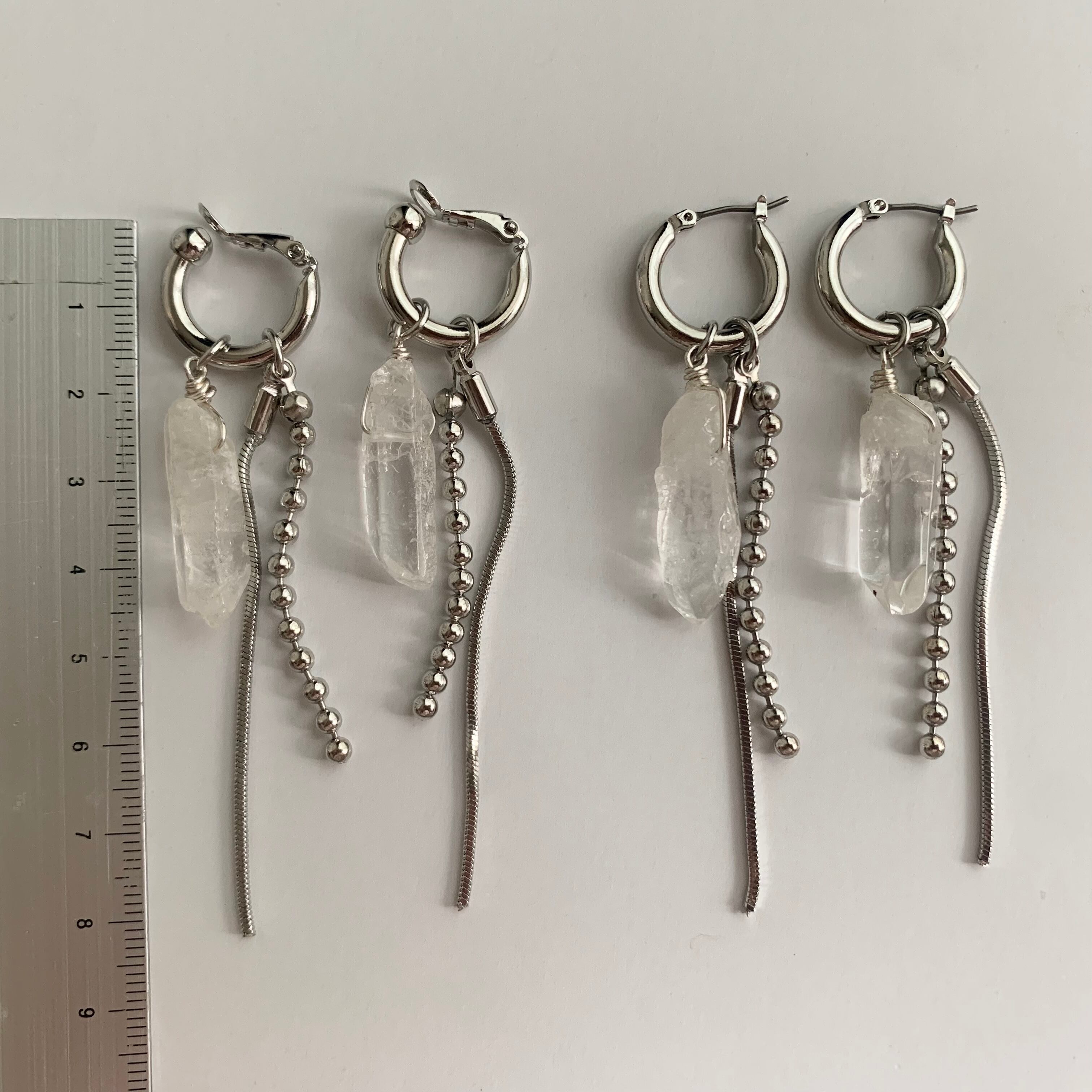 ※クリスタル部分は天然石のため、形と大きさが1点ずつ違ってきます。元々傷やヒビのような線が入っているものもありますが、天然素材の味としてご理解いただければと思います。左右なるべく近い大きさでペアにしておりますが、お写真と少し形が違う物になる事をご了承くださいませ。