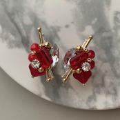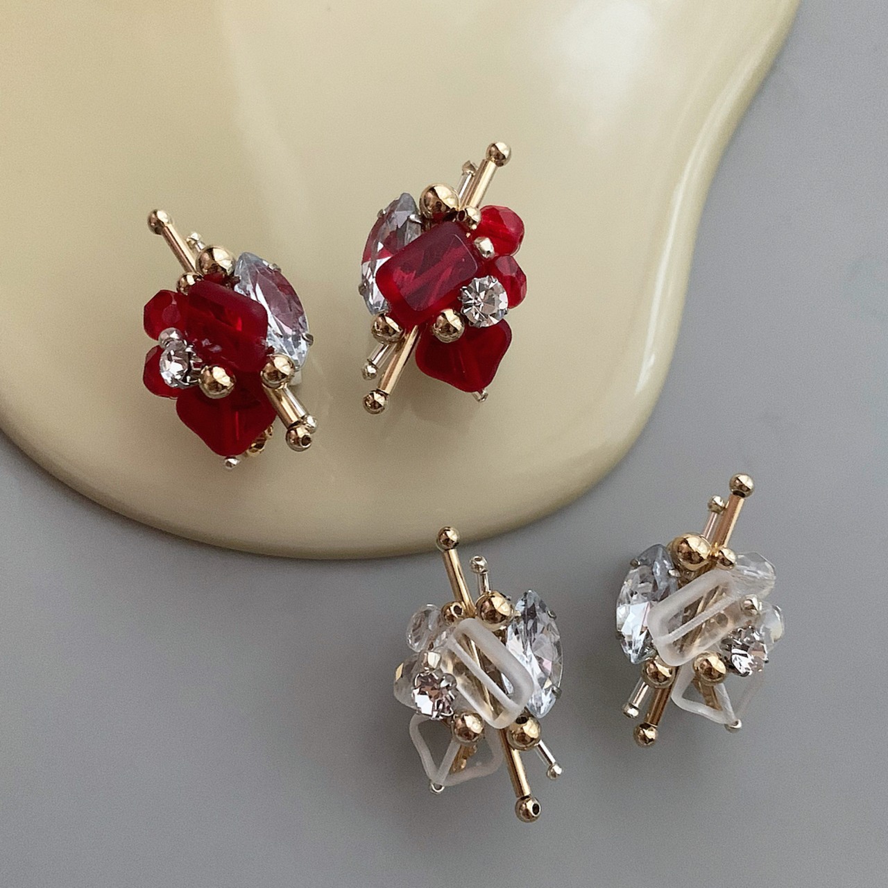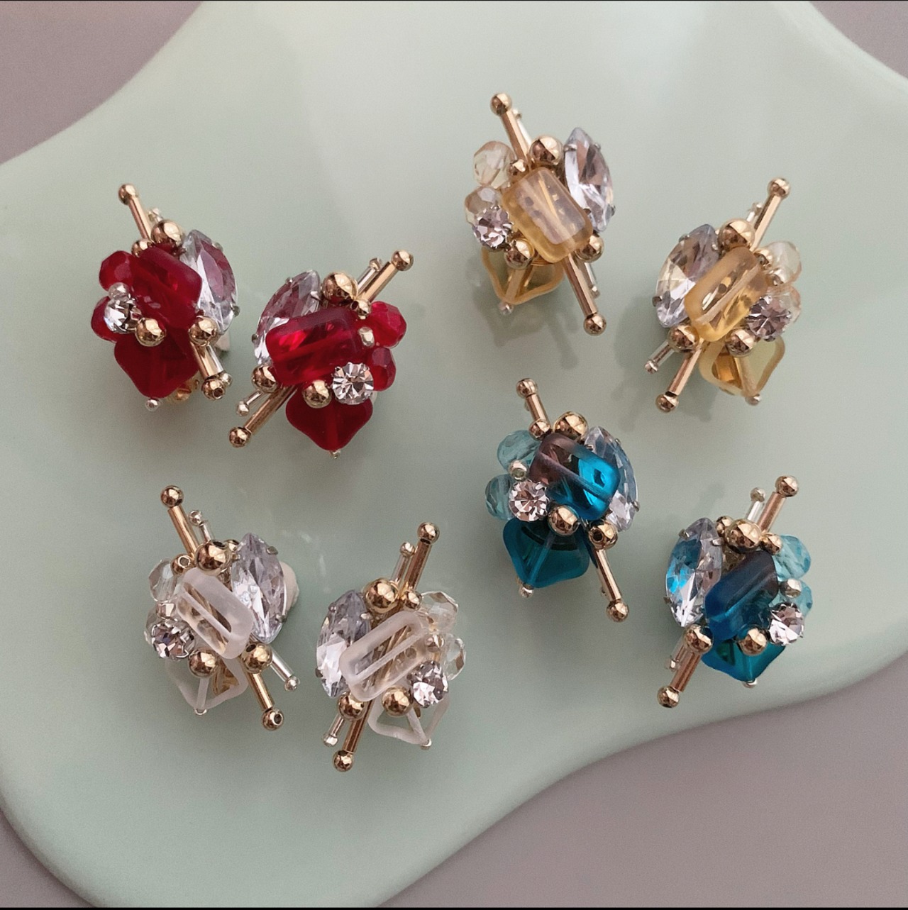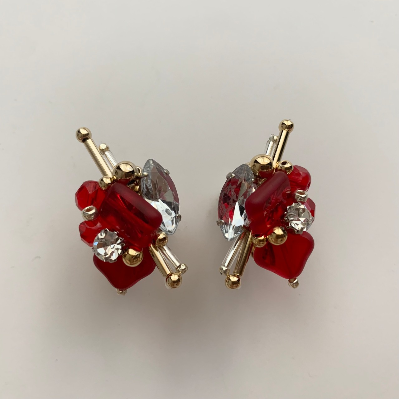 アーモンドアイ型のクリアビジューとゴールドのパイプを組み合わせシャープでラグジュアリーな雰囲気に。