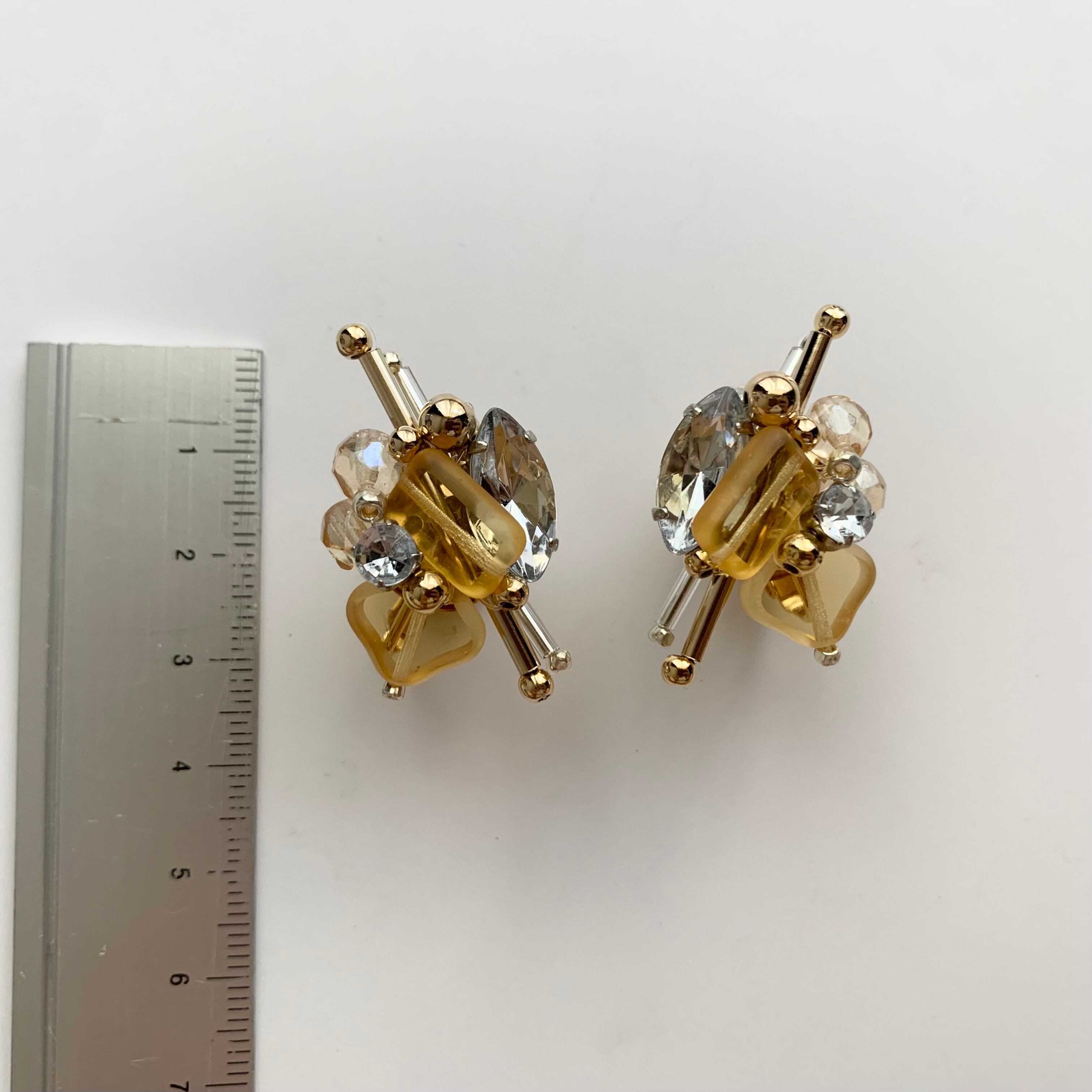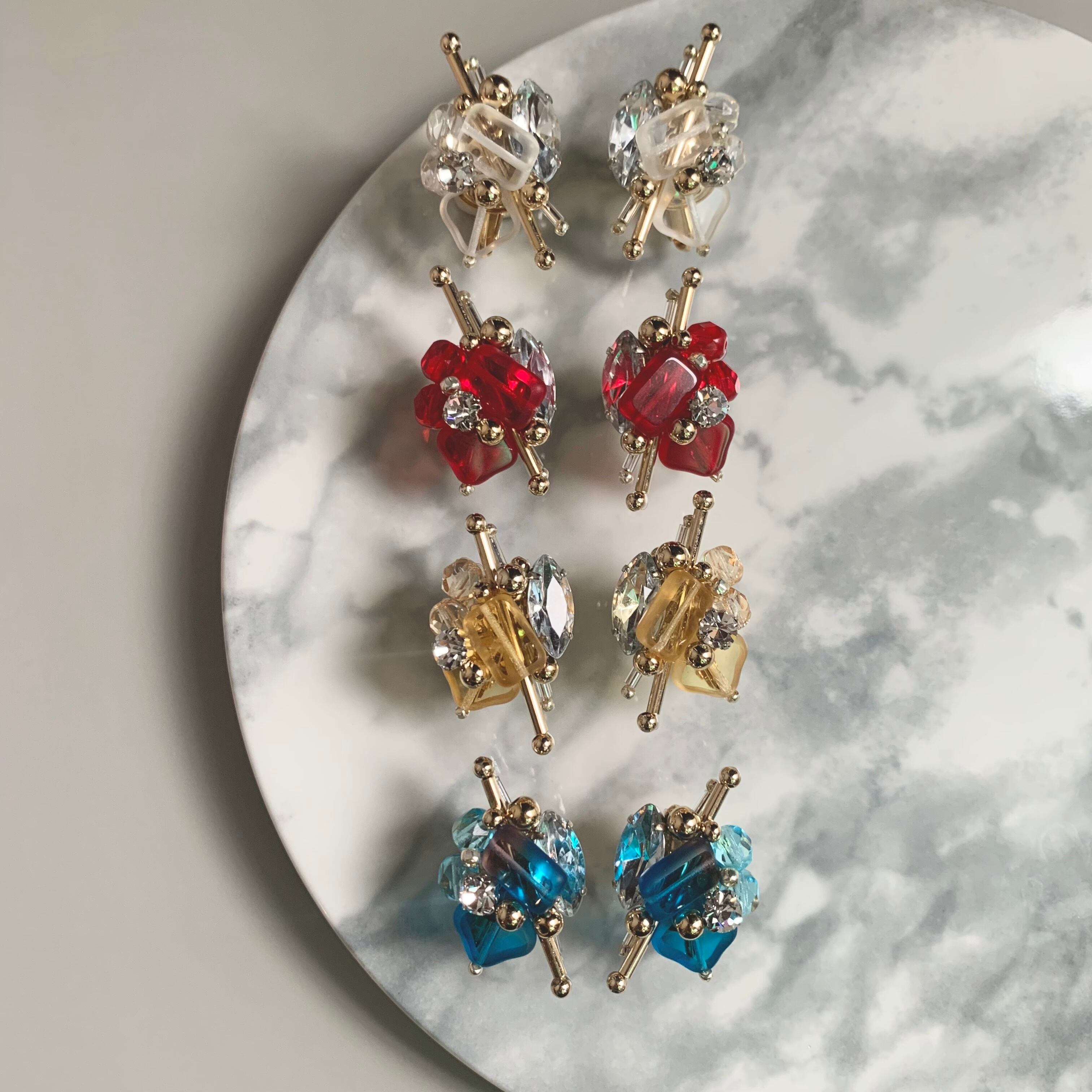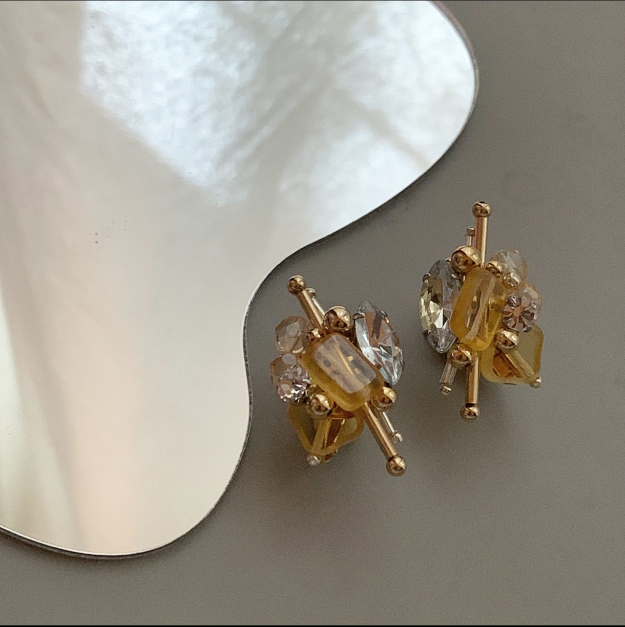 アーモンドアイ型のクリアビジューとゴールドのパイプを組み合わせシャープでラグジュアリーな雰囲気に。